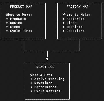 - React: Every job in requires Product, Step, and Target cycle time (among other values) in order to accurately determine downtimes. These values come from Product Map. Note that the step attribute stored in Product Map is "Unit cycle time", while React's target cycle time is per panel. If Product and Step when a React job is created, then the "Unit Cycle Time" from Product Map step attribute is automatically multiplied by the "Boards per Panel" from Product Map step attribute to get the React's "Target Cycle Time (per panel)".
