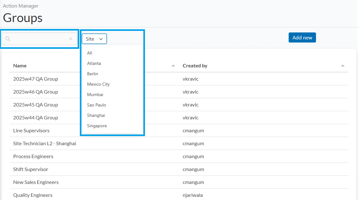 In the Groups page, you can see a complete list of all groups for your organization, along with the user who created each one. The table supports filtering by group name or by site, making it easy to locate groups in large deployments.