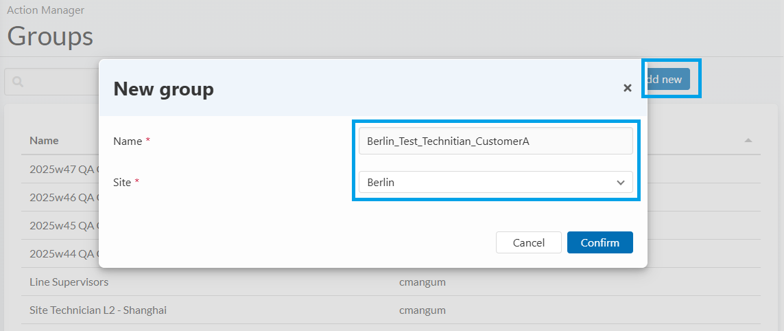 Groups are a core part of how Action Manager routes alerts. A Group represents a team, function, or role that should collectively receive alerts for specific triggers. Every customer defines their groups based on how their operations are organized. This means there are no fixed rules, and you can build groups that match your real production responsibilities, whether that is a single technician or an entire department.