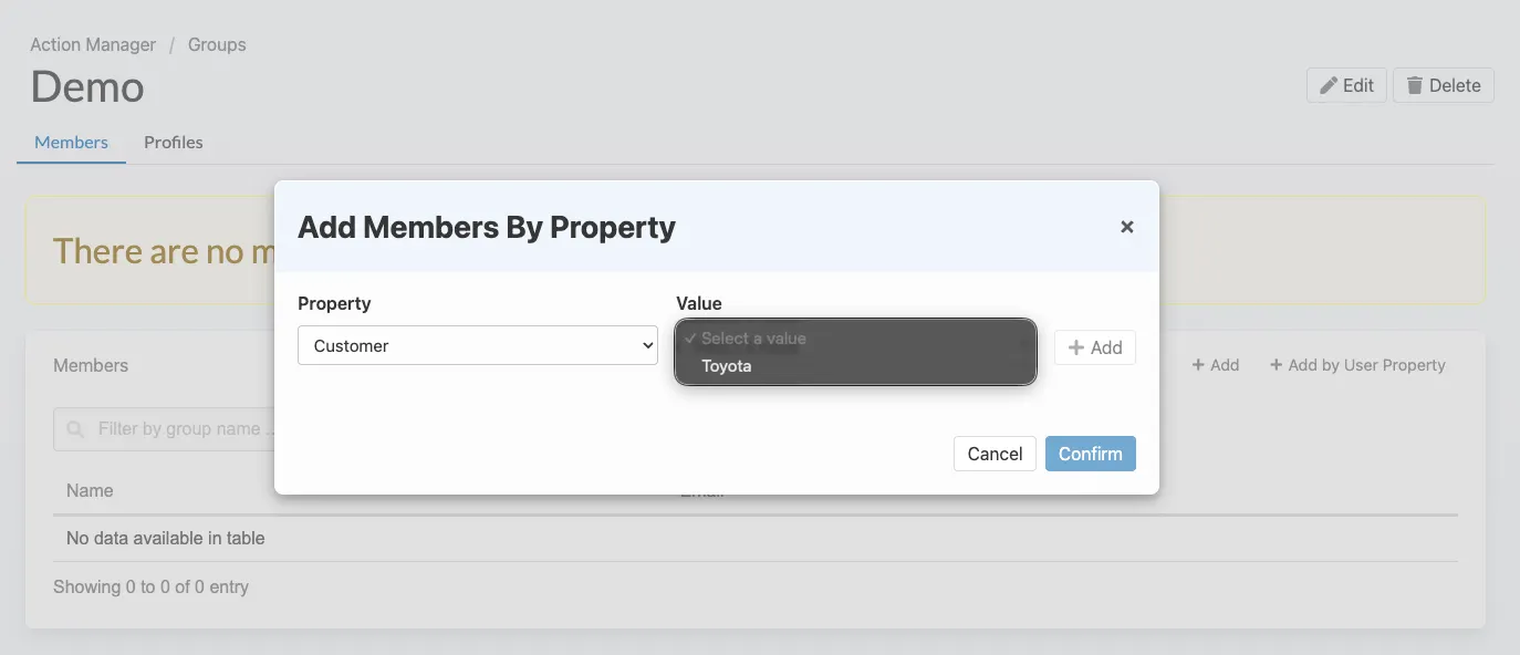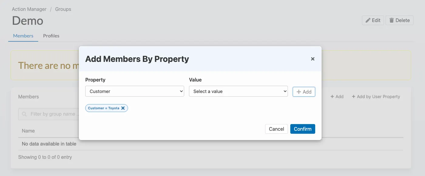 Q: Can I combine multiple properties when adding members? A: Yes. You can add multiple property filters in the modal before confirming. Users matching any of the filters will be added.
