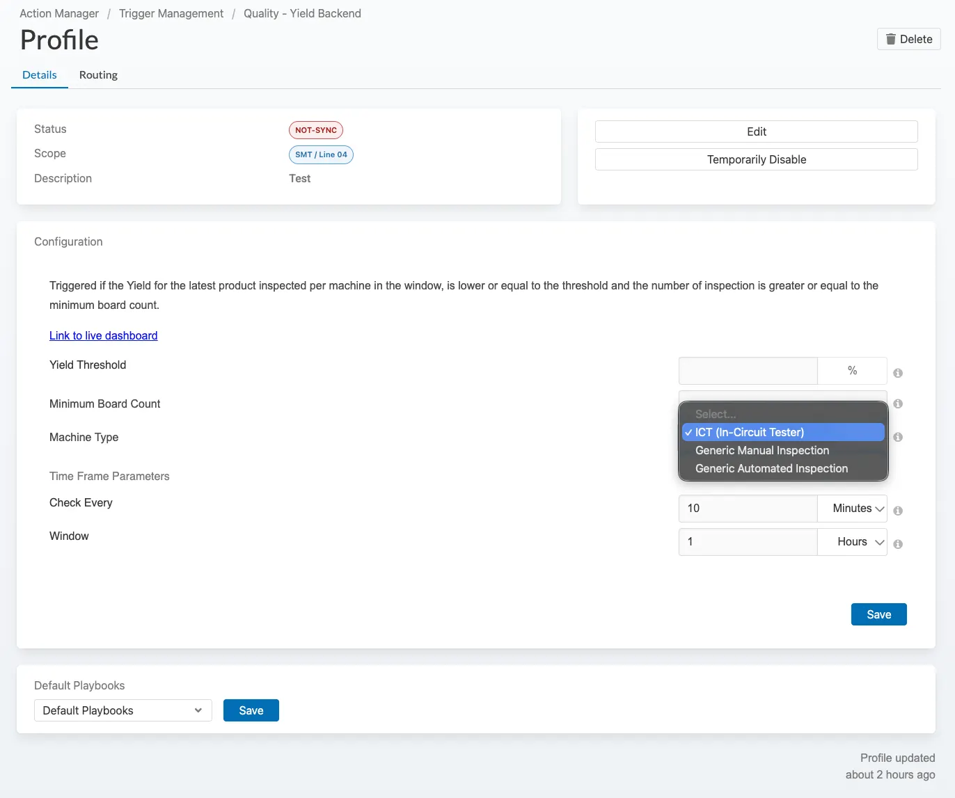 - Quality - Yield Backend: Yield for the latest product inspected per machine is at or below the threshold, and inspection count meets the minimum board count
